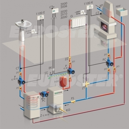 Regulator Euroster 2006 umożliwia pracę źródła ciepła ze stałą nastawą, czasową zmianą temperatury oraz nastawą zabezpieczenia przeciwzamrożeniowego 5°C.