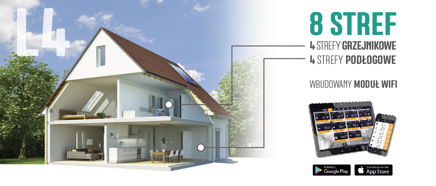 L-4 WiFi to sterownik do ogrzewania mieszanego przeznaczony do zarządzania zarówno urządzeniem grzewczym, jak i siłownikami zaworów regulującymi przepływ wody do maksymalnie 8 stref CO (4 strefy podłogowe i 4 grzejnikowe sterowane bezprzewodowo).