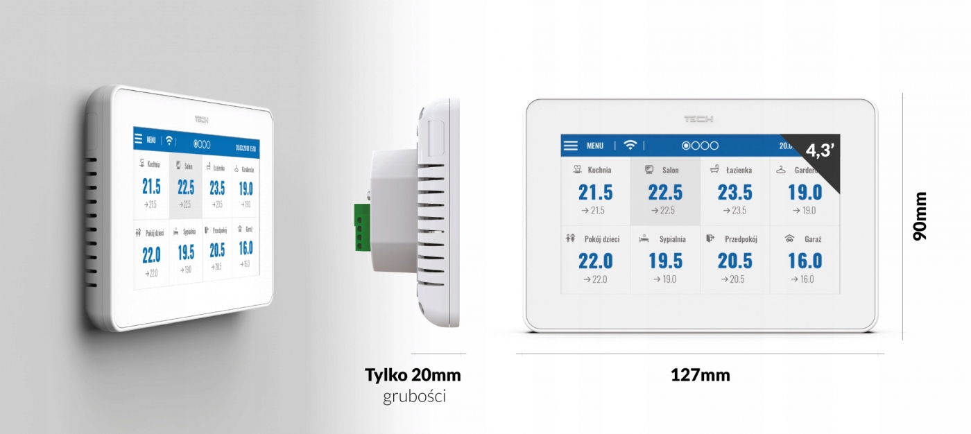 Czytelny, dotykowy panel umożliwia łatwe zarządzanie pracą podrzędnych urządzeń. Aby dokonać ustawień w podrzędnej sterownikowi strefie, wystarczy kliknąć obszar ekranu z informacją o jego stanie. Wygląd wyświetlacza panelu kontrolnego sterowników ogrzewania można dopasować do swoich potrzeb, korzystając z funkcji ustawienia ekranu. Można m.in. ustawić wygaszacz ekranu w postaci zegara albo daty. Dodatkowo użytkownik ma możliwość wyboru wersji kolorystycznej ekranu sterownika oraz włączenia lub wyłączenia dźwięku.