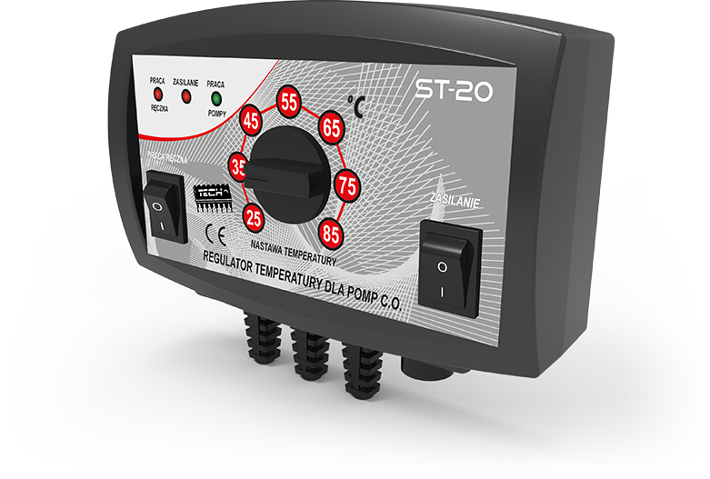 Regulator ST-20 przeznaczony jest do sterowania pompą obiegu wody centralnego ogrzewania. Ustawianie temperatury zadanej dokonujemy za pomocą potencjometru. Zadaniem regulatora jest: załączanie pompy, jeśli temperatura uzyska zadaną wartość, oraz wyłączanie jej – jeśli piec wychłodzi się o 2°C poniżej zadanej. Taki tryb pracy zapobiega niepotrzebnemu działaniu pompy, co pozwala zaoszczędzić energię elektryczną oraz przedłuża żywotność pompy i podnosi jej niezawodność.