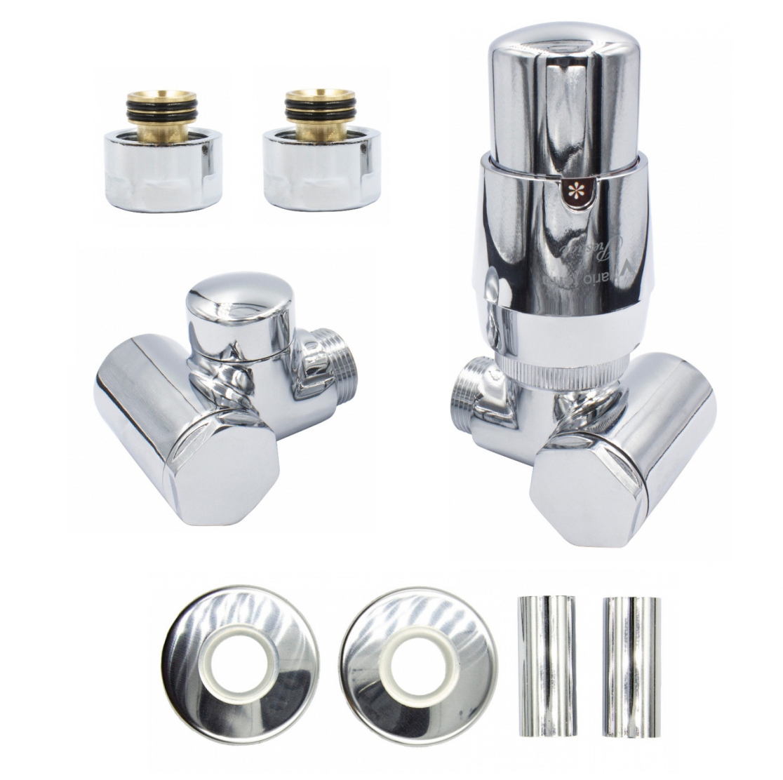 W zestawie: 1 x głowica termostatyczna "Prestige", 1 x zawór termostatyczny prawy , 1 x zawór odcinający lewy, 2 x rozeta maskująca pojedyncza , 2 x tuleja maskująca, 2 x adaptery na PEX